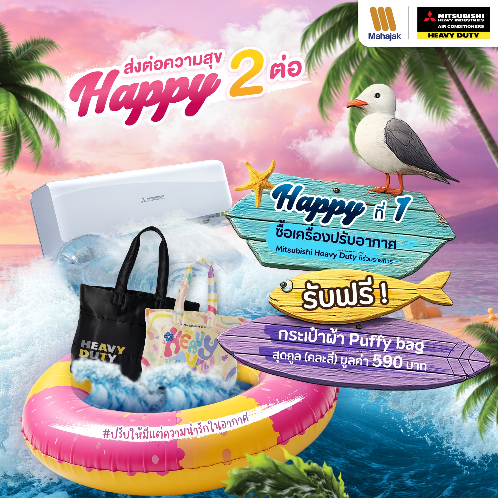 Happy ที่ 1: รับฟรี! กระเป๋าสุดชิค Puffy Bag ซัมเมอร์นี้จะออกไปเที่ยวไหนก็เก๋กว่าใคร เพียงซื้อเครื่องปรับอากาศ Mitsubishi Heavy Duty รุ่นที่ร่วมรายการ ได้แก่ Hoshi Series, Haru Series, Yuki Series, Fuyu Series และ Package Air ทุกรุ่น รับไปเลยฟรีๆ! กระเป๋า Puffy Bag สุดคิวท์ (คละลาย) มูลค่า 590 บาท (จำกัด 1 เครื่อง ต่อ 1 ใบนะคะ)